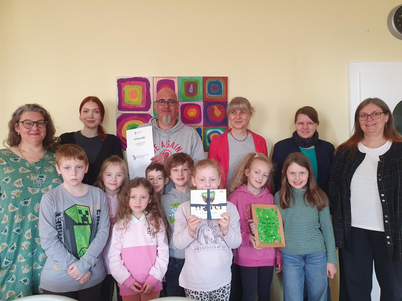 Geschäftsführerin Regina Kastner und Pfarrerin Sandra Herold überreichten die Urkunde und ein Geschenk und dankten besonders für die besonnene und ausgewogene Leitungskultur in den beiden Horten. Frau Schobert begann ihren Dienst gleichzeitig mit der Neugründung der „Kleinen Einsteins“ und arbeitete intensiv an der kontinuierlichen Fortschreibung der Konzeptionen und an der Teambildung in den beiden Einrichtungen.